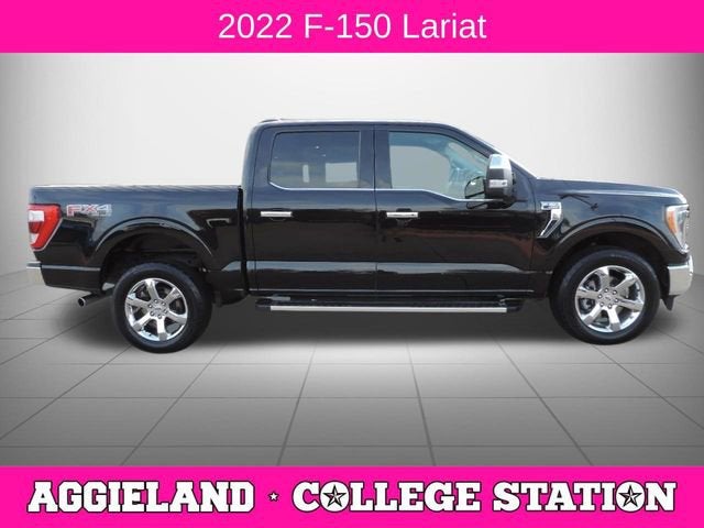 Power, prestige, and proven capability define this 2022 Ford F-150 Lariat 4x4 SuperCrew, finished in Agate Black Metallic with a refined Black leather interior. Built to handle demanding jobs while delivering premium comfort and advanced technology, this F-150 is ready for workdays, weekends, and everything in between.PERFORMANCE & CAPABILITY3.5L EcoBoost V6 EngineElectronic 10-Speed Automatic TransmissionFour-Wheel Drive (4x4)Trailer Tow PackageIntegrated Trailer Brake ControllerPro Trailer Backup AssistZone LightingSkid PlatesExtended-Range 36-Gallon Fuel Tank360-Degree Camera PackageAll-Terrain TiresHeavy-Duty SuspensionEXTERIOR FEATURESAgate Black Metallic Exterior20 Chrome-Like PVD WheelsLED Headlamps with Automatic High BeamsLED Daytime Running LightsPower Sliding Rear WindowPower Tailgate LockPrivacy GlassPower Heated Side MirrorsRunning BoardsBed Utility LightingSpray-In BedlinerINTERIOR & COMFORTLeather Bucket SeatsHeated & Ventilated Front SeatsPower Driver & Passenger Seats with LumbarDual-Zone Automatic Climate ControlPower Tilt/Telescoping Steering ColumnRemote Start SystemPush-Button StartPower Windows & Door LocksAuto-Dimming Rearview MirrorRear 60/40 Fold-Up Bench SeatTECHNOLOGY12 Touchscreen DisplaySYNC 4 with Enhanced Voice RecognitionApple CarPlay & Android AutoNavigation SystemB&O Sound SystemFordPass Connect with 4G LTE WiFi HotspotWireless Charging Pad360-Degree CameraBlind Spot Monitoring with Cross-Traffic AlertLane Keeping SystemADVANCED SAFETY FEATURESPre-Collision Assist with Automatic Emergency BrakingRear Cross-Traffic AlertBlind Spot Information System (BLIS)Lane-Keeping AssistPost-Collision BrakingAdvanced Airbag SystemTire Pressure Monitoring SystemRear View CameraStability & Traction ControlWHY BUY FROM AGGIELAND CHEVROLET?At Aggieland Chevrolet, we make upgrading to your next truck simple and stress-free.Transparent, market-based pricingNo-pressure, customer-first experienceFinancing solutions for every credit situationExperienced service departmentProudly serving College Station, Bryan, and the Brazos ValleyWere committed to delivering a dealership experience built on trust and long-term relationships.Listo para manejar esta poderosa Ford F-150 Lariat 4x4 2022? Visitanos hoy en Aggieland Chevrolet y descubre por que somos la mejor opcion en el Brazos Valley. Nuestro equipo esta listo para ayudarte con financiamiento facil y atencion excepcional. Te esperamos!